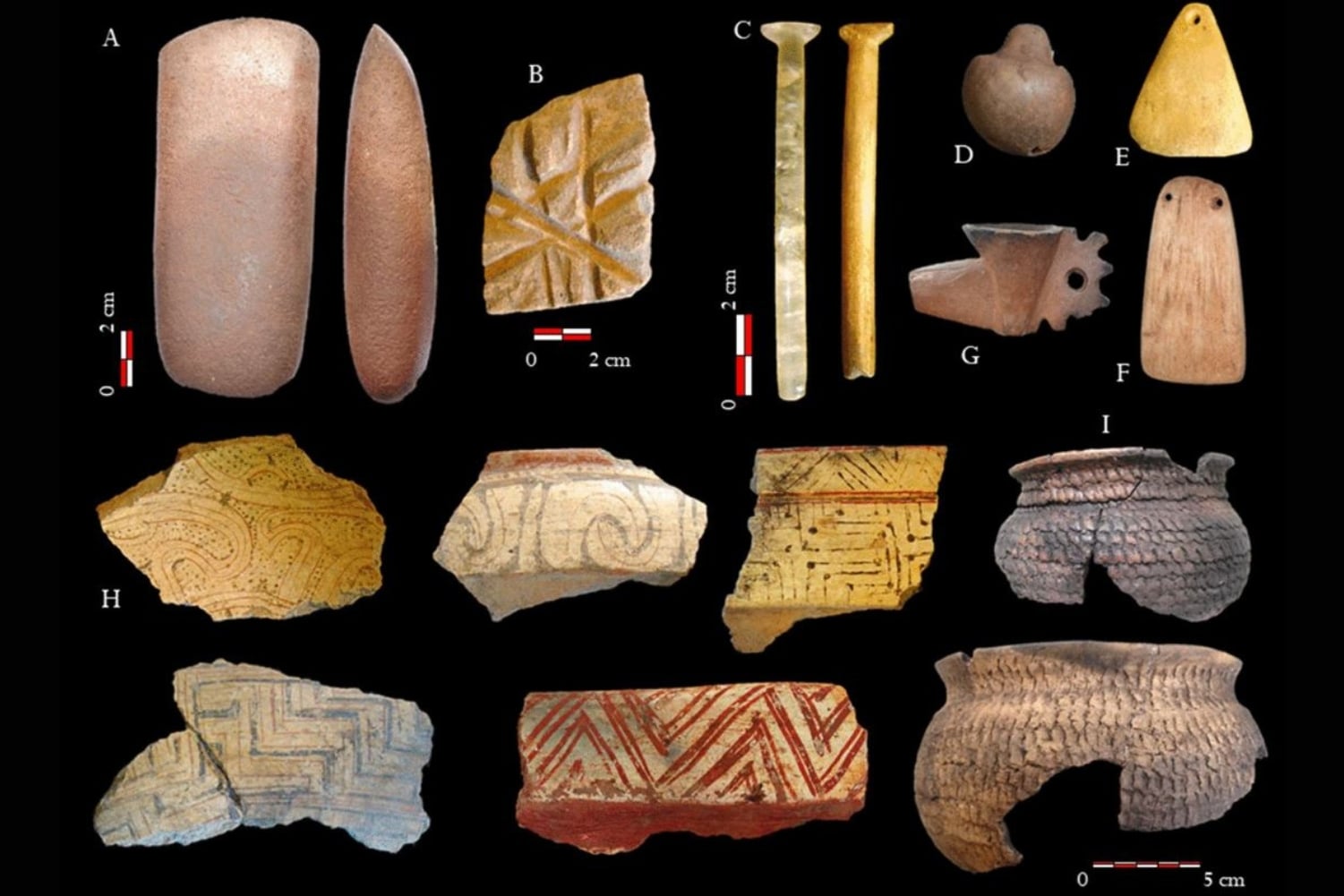 1) Exemplos de objetos Guarani. A: Lâmina de machado de pedra em formato retangular. B: Pedra de amolar. C: Tembetás (ornamentos labiais) de quartzo e osso. D: Pingente de cerâmica. E–F: Pingentes de osso. G: Cachimbo de cerâmica. H: Cerâmica pintada com o estilo geométrico típico guarani (vermelho e preto sobre fundo branco). I: Vasilhas corrugadas. As escalas são aproximadas. Crédito da imagem - LOPONTE, Daniel e coautores (2025).