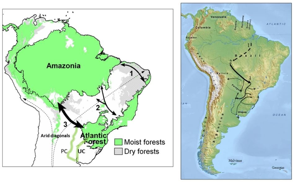 3) À esquerda: principais corredores naturais de conexão entre a Amazônia e a Mata Atlântica. 1 = rota nordestina. 2 = rota central. 3 = rota sudoeste. PC = Corredor do Sul do Paraná. UC = Corredor do Uruguai (adaptado de Machado et al. 2021 e www.conexoesamazonicas.org). À direita: visão geral da expansão territorial ao sul da família linguística tupi-guarani, desde o baixo rio Xingu (1) até o sudoeste da Amazônia (2), as nascentes da Bacia do Prata (3) e o rio da Prata (4). Crédito da imagem - LOPONTE, Daniel e coautores (2025).