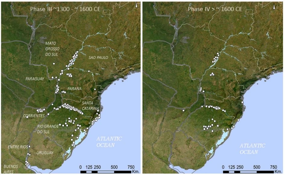 Assim, o pós 1600 d.C inaugura a quarta e última fase, correspondendo ao período histórico e de resiliência dos povos indígenas durante a expansão europeia. Nessa fase, os sítios concentram-se em áreas onde o controle europeu ainda não era efetivo e diminuíram em áreas colonizadas pelos europeus. A expansão Guarani para fora da Amazônia se destaca como uma das mais notáveis migrações documentadas entre populações canoeiras. A expansão provavelmente envolveu uma combinação de deslocamentos de longa distância liderados por populações pioneiras, juntamente com movimentos de média a curta distância. Esse padrão diverso de colonização traz implicações significativas para a arqueologia Guarani, particularmente no que diz respeito à dinâmica de demografia, evolução cultural, inovação e sistemas de aprendizagem dentro da sociedade, e estendem os limites da pesquisa em novas direções empolgantes.