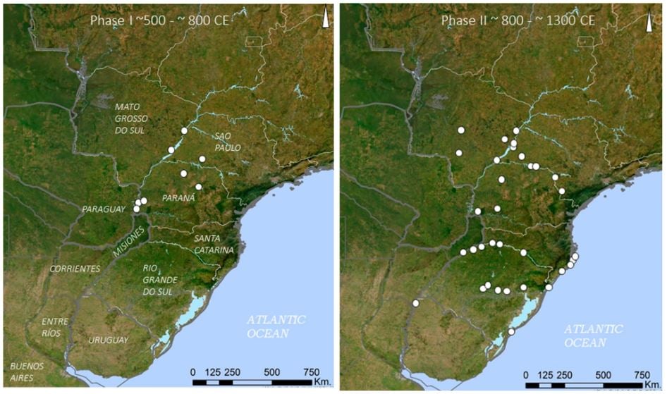 5) Distribuição dos sítios arqueológicos guarani datados incluídos na Fase I (à esquerda) e na Fase II (à direita). As duas datas de radiocarbono de Albino Mazzari estão incluídas na Fase II. Crédito da imagem - LOPONTE, Daniel e coautores (2025).